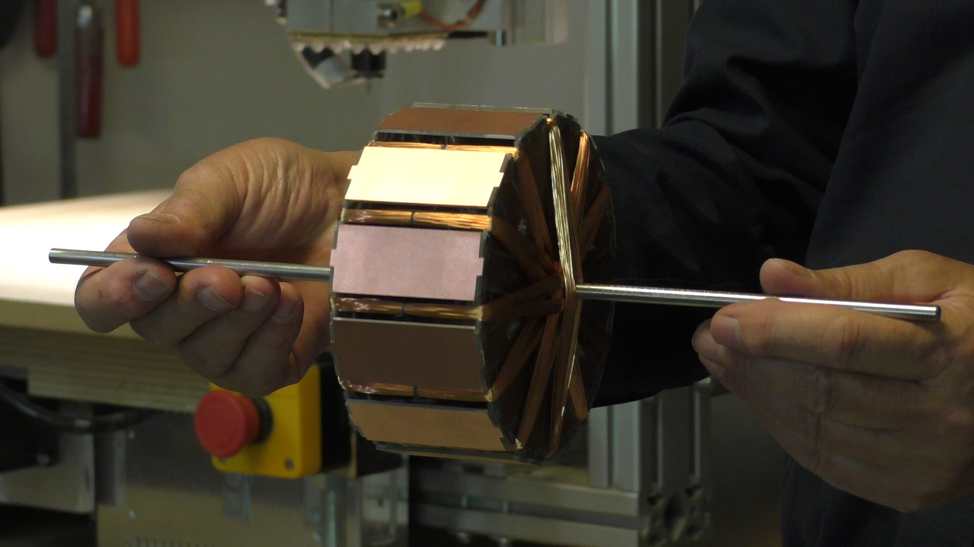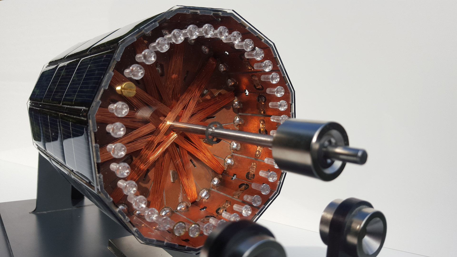 Bei dem Korpus dieses Solarmotors handelt es sich um einen 12-kantigen Zylinder, welcher auf jeder seiner 12 Seitenflächen mit Solarzellen ausgestattet ist. Im Inneren des Korpus befinden sich sechs Spulen, die durch den erzeugten Strom der Solarzellen versorgt werden. Zu jeder Wicklung, sind zwei gegenüberliegende Solarzellenreihen parallel geschaltet. Pro Fläche wurden jeweils drei Solarzellen in Reihe verdrahtet, um die Feldstärke der daran angeschlossenen Spulen im Inneren des Korpus zu erhöhen. So versorgen die dem Licht zugewandten Solarzellen, die jeweilige Spule mit Strom und erzeugen ein Magnetfeld, welches sich von dem entsprechend gepolten Feldmagneten abstößt. Durch diese abstoßende Kraft entsteht eine Drehbewegung des Solarmotors. Die im Licht stehende Solarzellen-Reihe dreht sich aus- und die nächst folgende Reihe ins Licht.