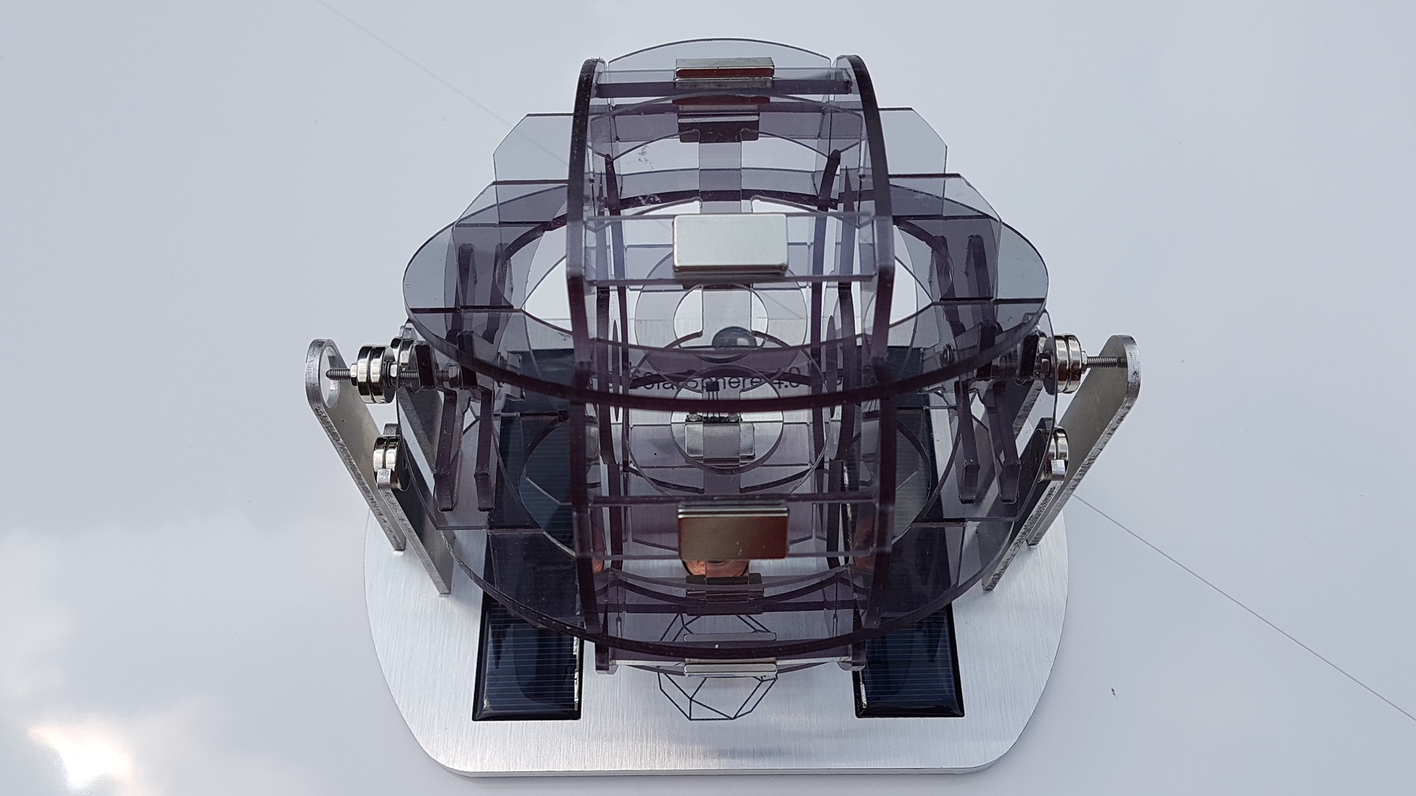 Die 300 g schwere und 14 cm große aus Polycarbonat gefertigte Kugel hat die geometrische Form eines Rhombenkuboktaeder. Sie besticht durch ihr Design und ihrer Haptik. Er dreht ästhetisch schwebend, absolut verschleißfrei, geräuschlos rotierend, Tag und Nacht ohne Unterbrechung. Pro Umdrehung wird der Rotor durch acht kurze Impulse angetrieben. 36 Neodym - Magnete sorgen für einen ruhigen Lauf. Die komplette Steuerung für den Antrieb, die Beleuchtung, sowie das Energie-Management sind in der Bodenplatte verbaut. 2 Stunden Sonnenlicht reichen aus um ihn tagelang drehen zu lassen. Oder die Energie eines Teelichts (Wachsmasse 15g, Brenndauer 4,5h) reicht aus, um den Rotor durchgehend monatelang anzutreiben.