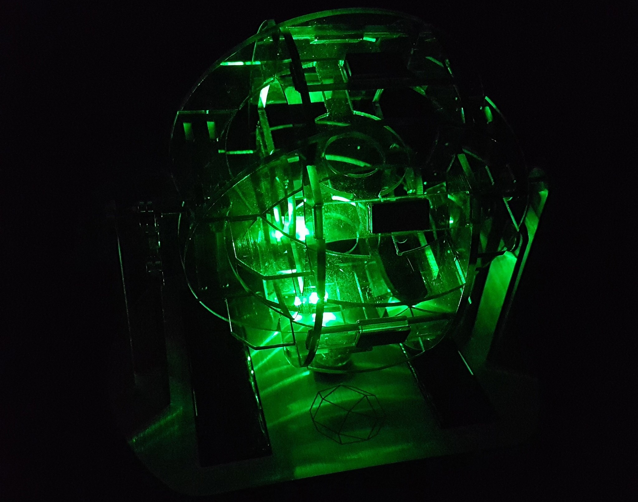 The 300 g and 14 cm polycarbonate sphere has the geometric shape of a rhombicuboctahedron. It impresses with its design and haptics. The bearing consists of a ceramic ball and a sapphire glass. She floats all the time. The sphere is absolutely wearfree and noiseless.It rotates day and night without interruption. Per rotation, the rotor is driven by eight short impulses. 36 Neodymium magnets ensure a smooth run. The complete control for the drive, the lighting and the energy management are built into the base plate. Two hours of sunlight are enough to keep it turning for days.