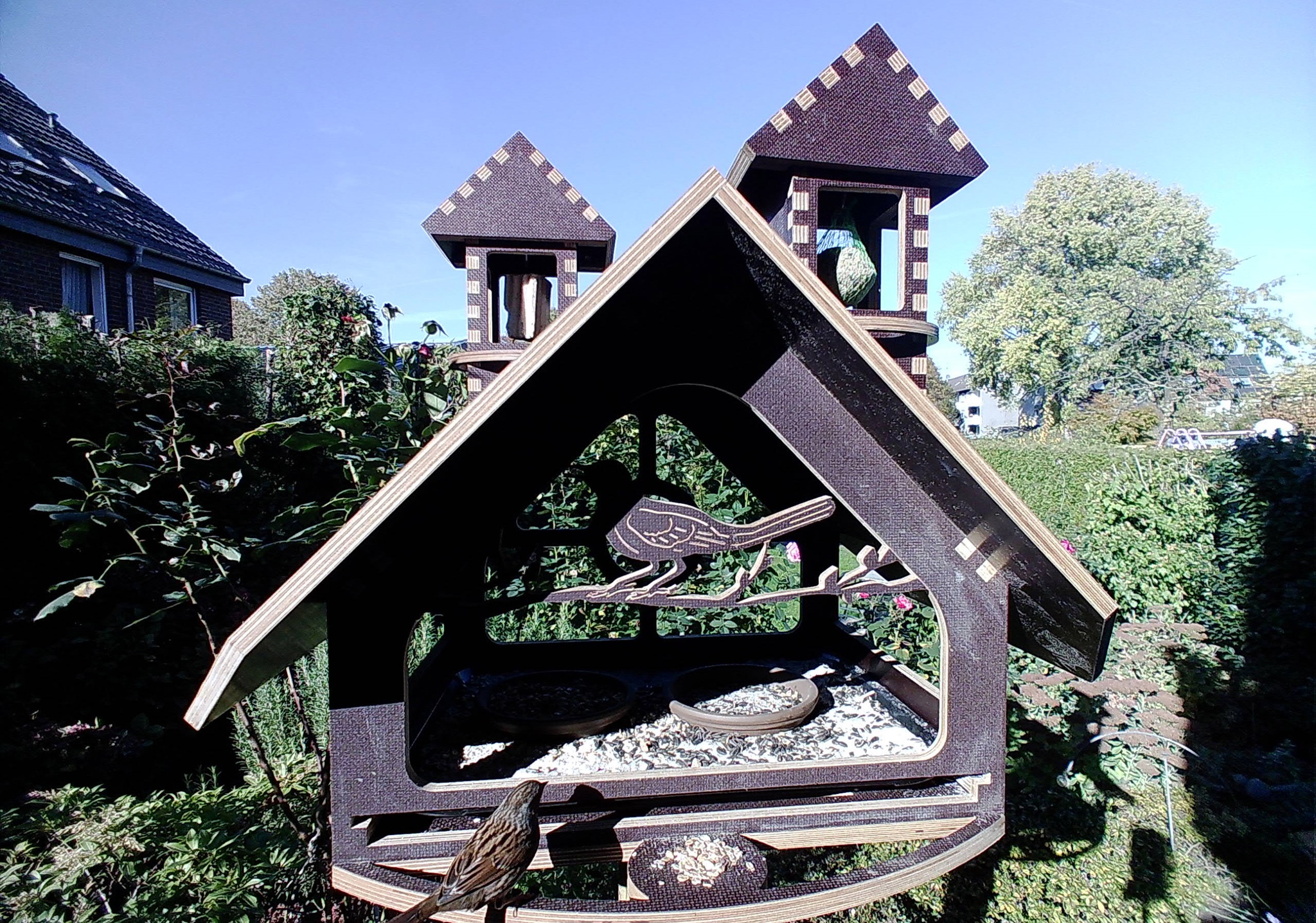 Das, aus wasserfestverleimten Siebdruckplatten gefertigte Vogelhaus ist vor Nässe geschützt. Es besticht durch seine Funktionalität und Optik. Die Bodenwanne ist aus hygienischen Gründen herausnehmbar und besteht, zur vereinfachten Reinigung, aus wetterfestem Kunststoff. Die beiden Nahrungstürme sind so angeordnet, das herabfallende Futterreste von der Bodenwanne aufgefangen werden. Die Turmdächer sind abnehmbar, wodurch sich das Wechseln, z.B. der Meisenknödel, sehr funktionell gestaltet.